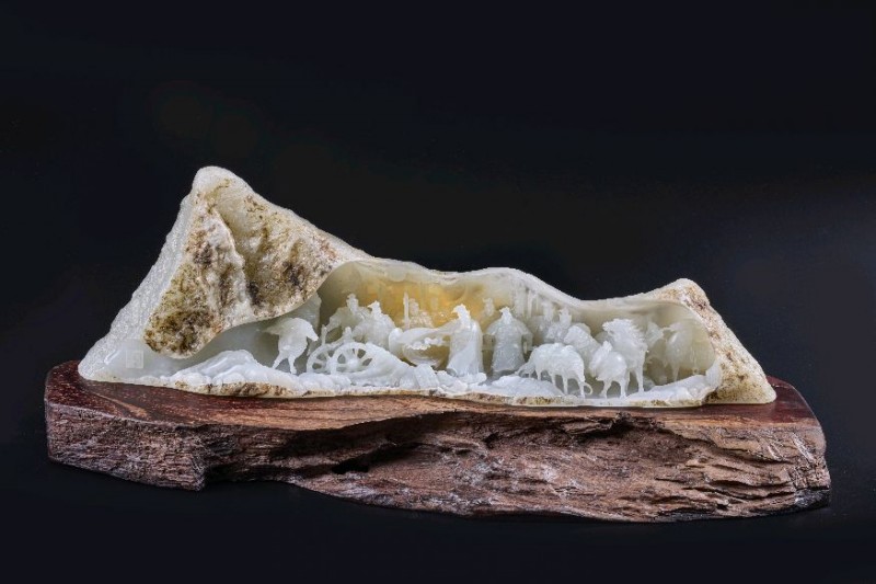 有的作品像山体剖面,内部暗藏千军万马、楼台人物;有的作品像玉中佛国,一灯微启,万象随之而生;有的作品保留原石粗粝外皮,让内部精雕更显神奇;有的作品在一片温润月白中,雕出人物衣袂、马蹄、羽翼、荷瓣、云纹,仿佛空气都在流动。