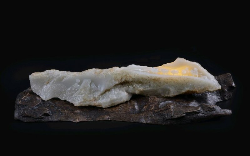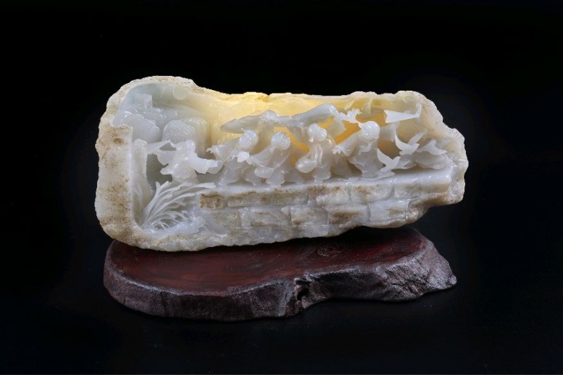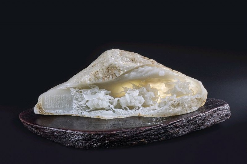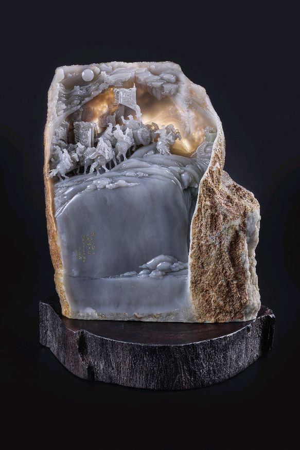 黑色背景里,一方白玉静置于木座之上。玉石半开半合,像一座被时光剖开的山体,也像一枚仍在呼吸的茧。玉壳之内,人物、楼阁、仙禽、车马、花叶、云气,层层叠叠地隐现出来:有的如神话初生,有的如历史回响,有的像是从石中走出,又像是正要重返石中。灯光照过去,温润的玉质透出微微乳白与淡金的光,整件作品既有山河的苍茫,又有梦境的轻灵。
