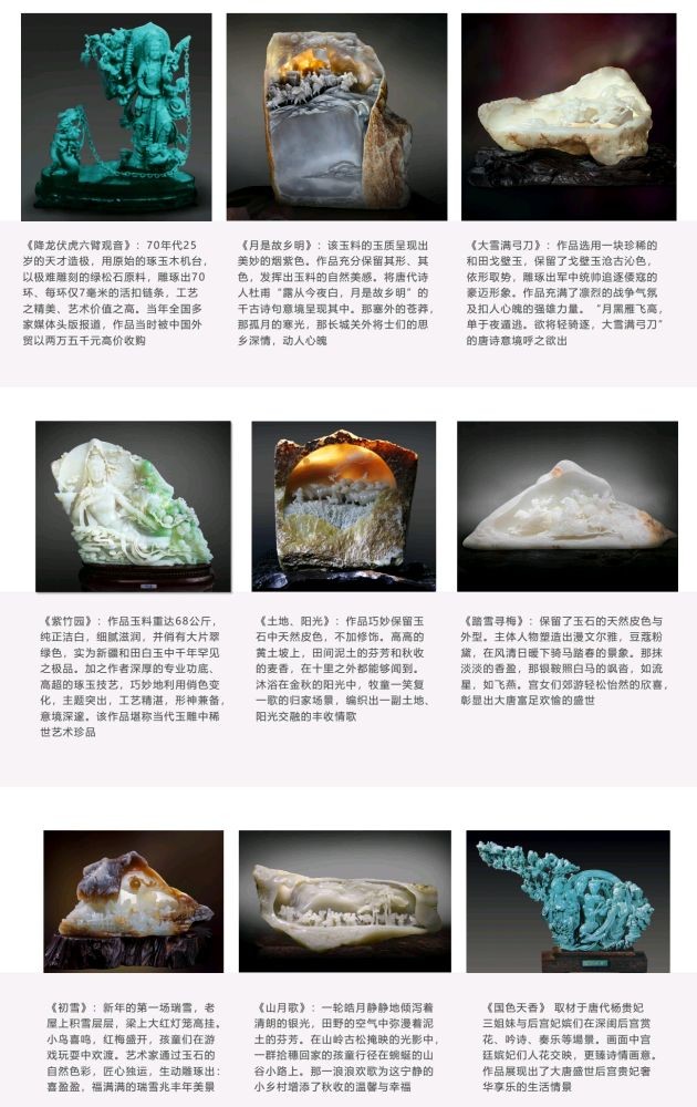文稿中提到,他主编《玉器专业技术培训大纲》,发表《绿松石综合利用研究》,出版个人作品专集,举办个人玉雕作品展,并长期进行理论研究。更重要的是,他的许多作品并不只靠形象取胜,还常常配以诗句、名言,形成一种诗、画、雕相互发明的意境。