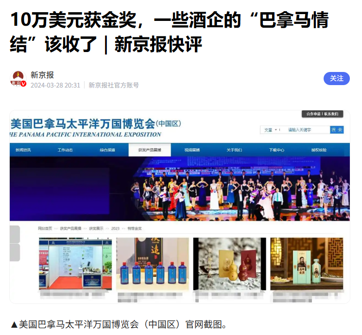 报告显示,2023至2026年间虚假宣传类违法已占白酒行政处罚的80%以上,罚款总额累计破亿元。其中最具代表性的便是被明码标价的“国际金奖”收割链。以美国巴拿马万国(国际)博览会组委会北京代表处为代表的机构,因虚构与1915年博览会的历史承袭关系,被监管部门定性为引人误解的虚假宣传。这类机构将金奖标价30至50万不等,无需寄酒评审,给钱即可发证。