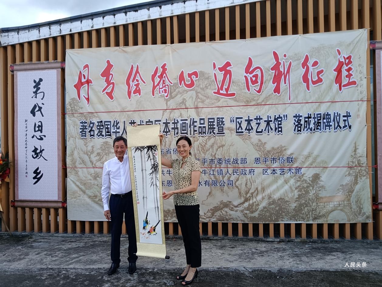 人民头条讯:金秋时节,翰墨飘香。8月15日下午,“丹青绘侨心、迈向新征程”著名爱国华人艺术家区本书画作品展暨“区本艺术馆”落成揭牌仪式在著名侨乡恩平市牛江镇隆重举行。新西兰爱国华人艺术家区本伉俪,江门市侨联党组书记、主席林春晖,恩平市委常委、统战部部长何坚培等领导嘉宾出席并致辞,300多名侨界人士、父老乡亲参加落成揭牌仪式并欣赏首批陈列布展的区本国画书法代表作。
