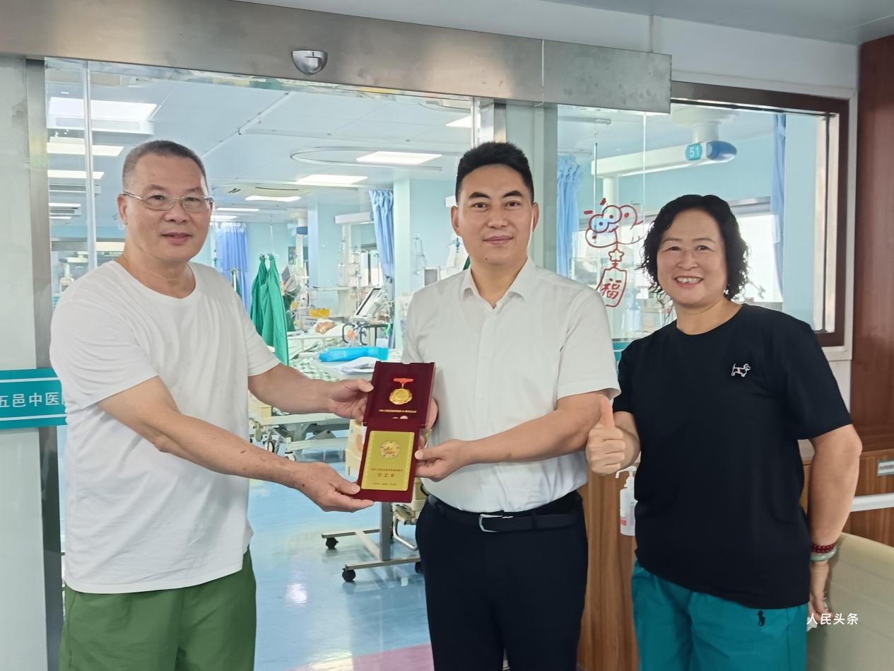 8月21日,在纪念中国人民抗日战争暨世界反法西斯战争胜利 80 周年之际,江门市委统战部常务副部长、机关党委书记韩志勇前往五邑中医院,走访慰问抗战时期及以前参加革命工作的离休干部、老党员李灵同志。在重症病房内,韩志勇代表部机关全体党员干部,向这位革命前辈致以崇高敬意,将中共中央、国务院、中央军委颁发的 “中国人民抗日战争胜利 80 周年” 纪念章郑重交到家属代表手中,并关切询问其身体状况和治疗情况。