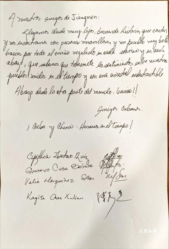 图为古巴国际电视台记者为江门市侨媒中心题词留念