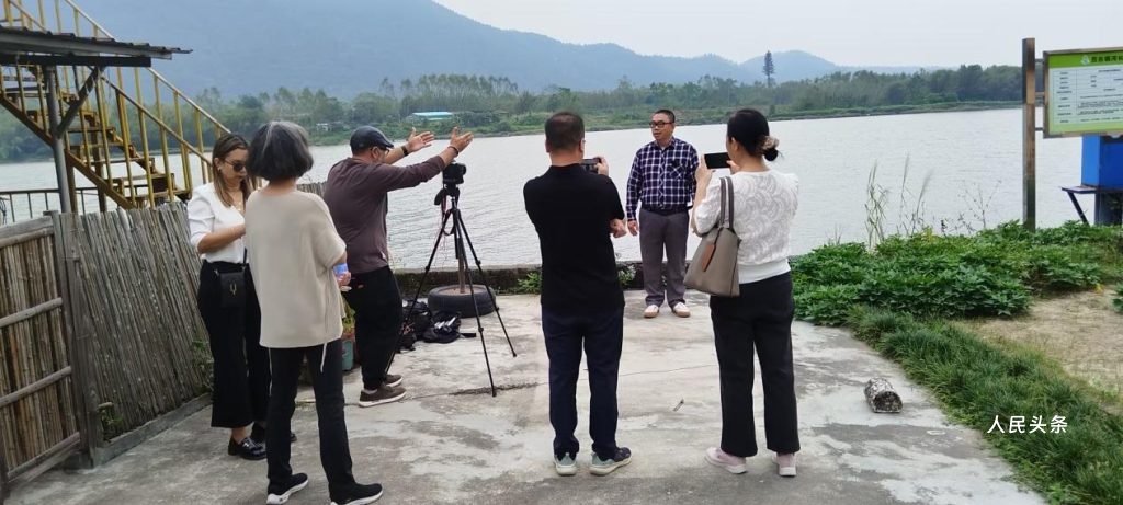 图为古巴国际电视台记者在拍摄开平人昔日登船出洋的潭江渡口码头