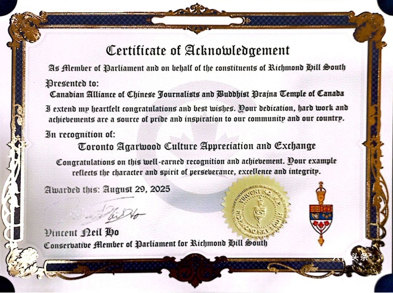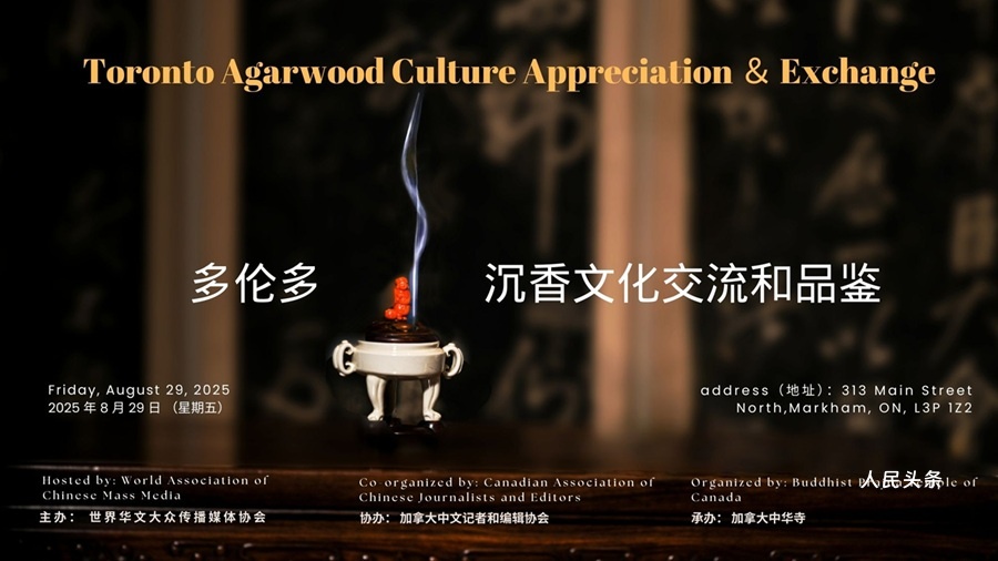 (《世界华文媒体》2025年8月29日多伦多报道)初秋的多伦多,仿佛被一缕跨越千年的香气环绕。在加拿大中华寺,钟声悠然回荡,袅袅沉香烟雾升腾,如同写给苍穹的书法。佛教、道教、天主教、基督教的信众齐聚一堂,不为教义,只为一种超越语言的共通感受——沉香。