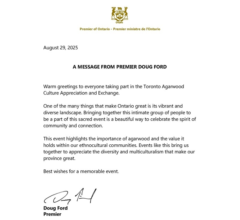 – 安大略省省长道格·福特(Doug Ford)致贺,称沉香是安省多元文化的瑰宝,赞美本次盛会是“凝聚社群、庆祝多元的盛会,让我们的省份更加伟大。”