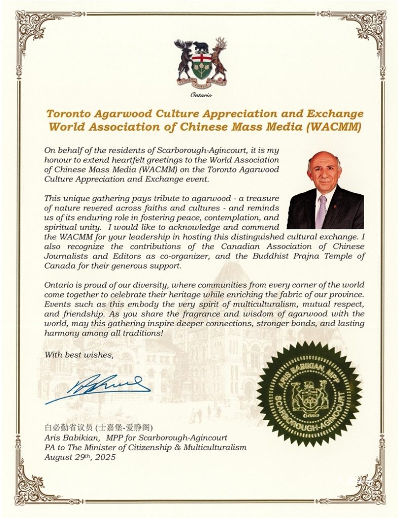 – 省议员白必勤(Aris Babikian, MPP)致贺,称沉香为“跨越信仰的文化瑰宝”,祝愿活动“促进深度交流与持久和谐”。