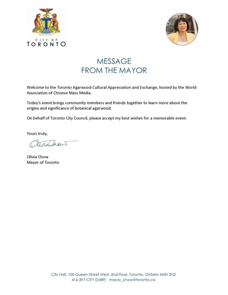 – 多伦多市长邹至蕙(Olivia Chow, MPP)致贺,称沉香为“文化根源的提醒与精神深度的象征”。